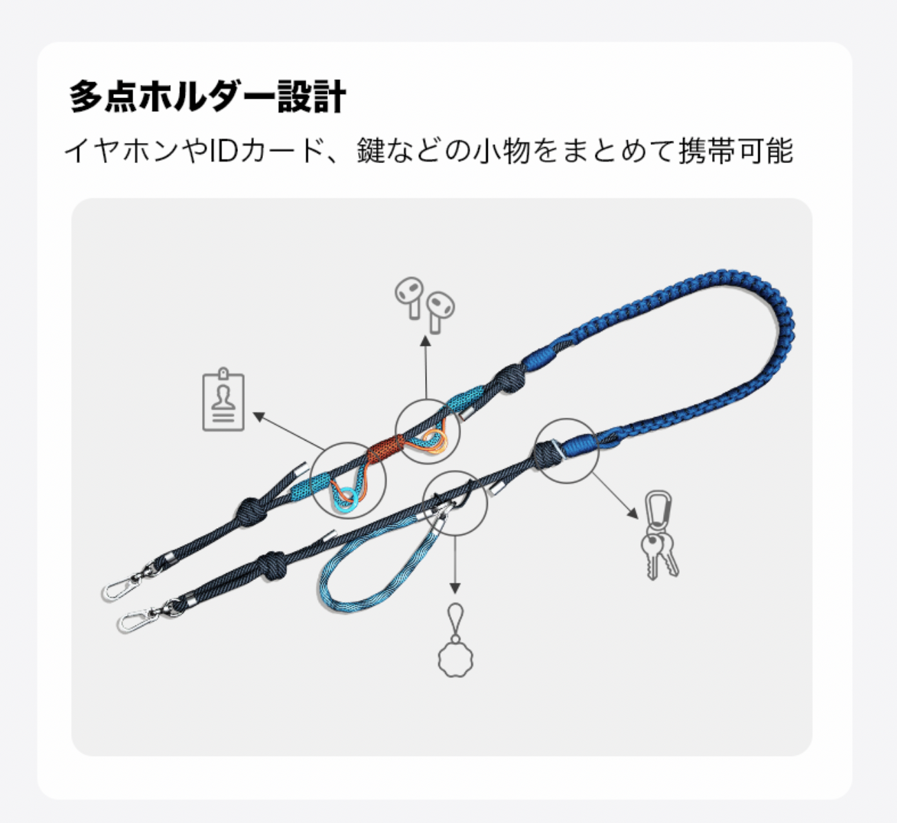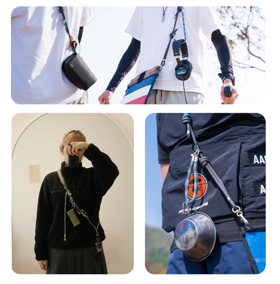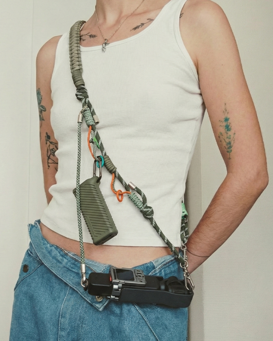 複数の取り付けポイントを備え、イヤホンやIDカード、鍵などの小物をまとめて携帯可能。T型プレート対応により、スマートフォンやOSMO Pocket、軽量カメラなどにも幅広く対応し、これ一本で多用途に活躍します。