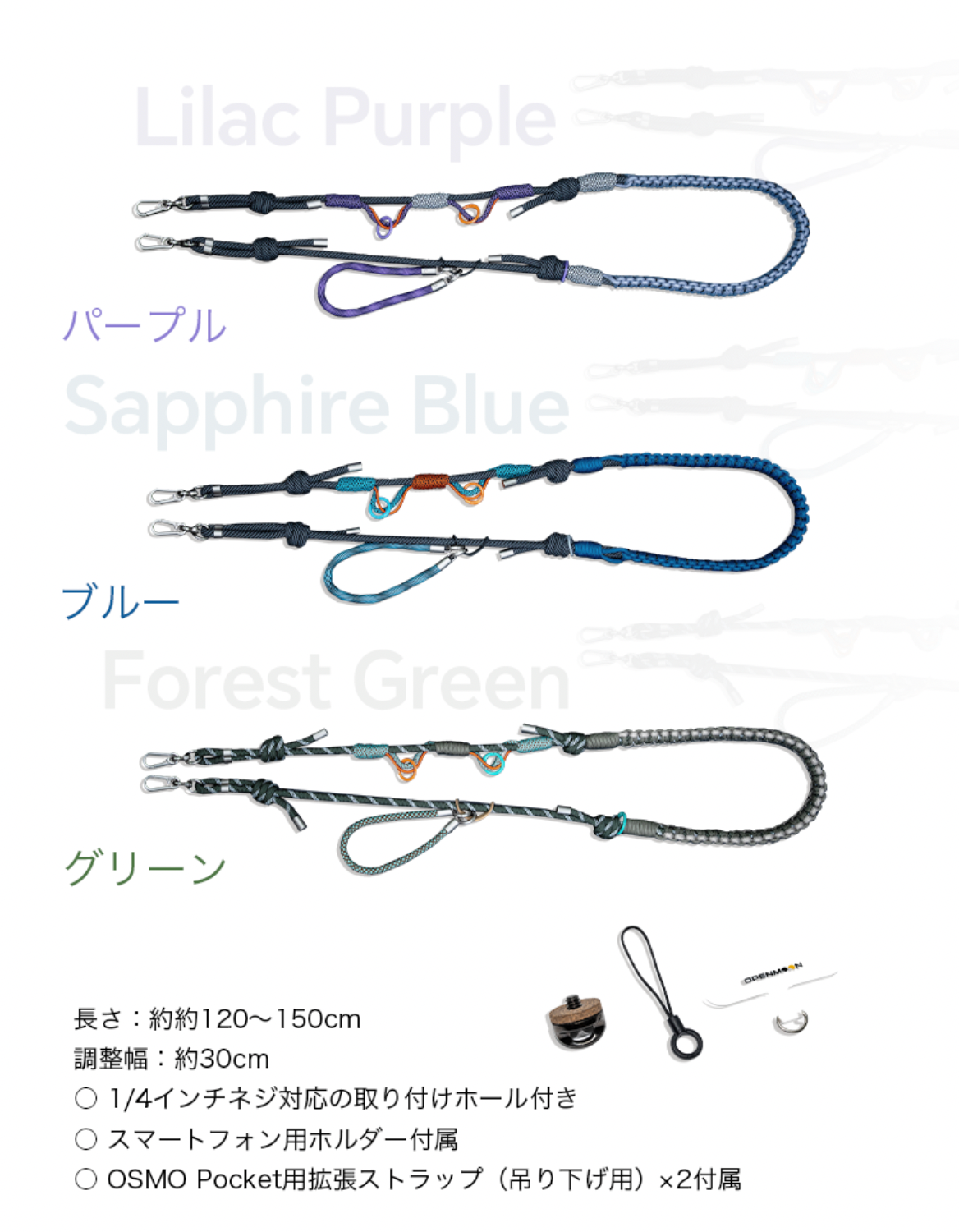 OPENMOON 多機能ショルダーストラップ PRO スマホ カメラ イヤホン Osmo Pocket対応 T型プレート付き ハンドストラップ兼用 長さ調節可能 パープル/グリーン/ブルー